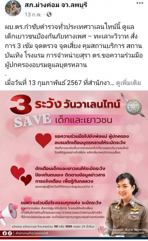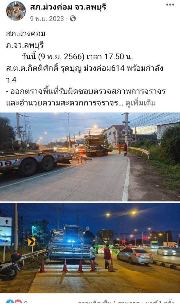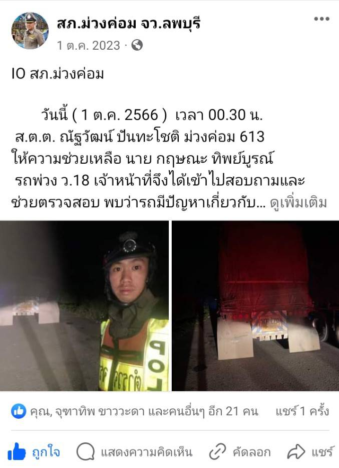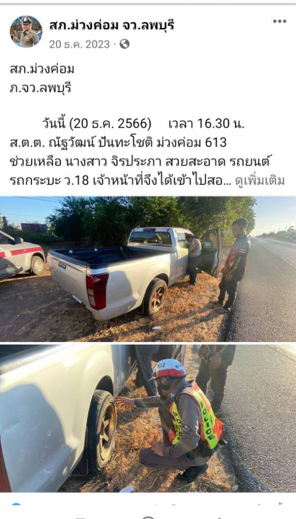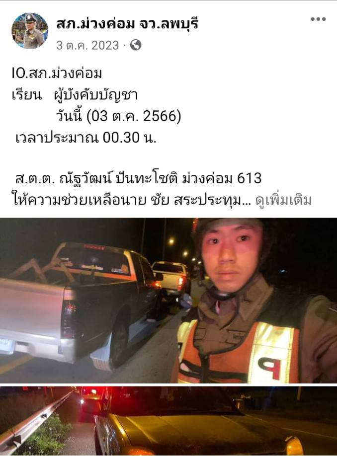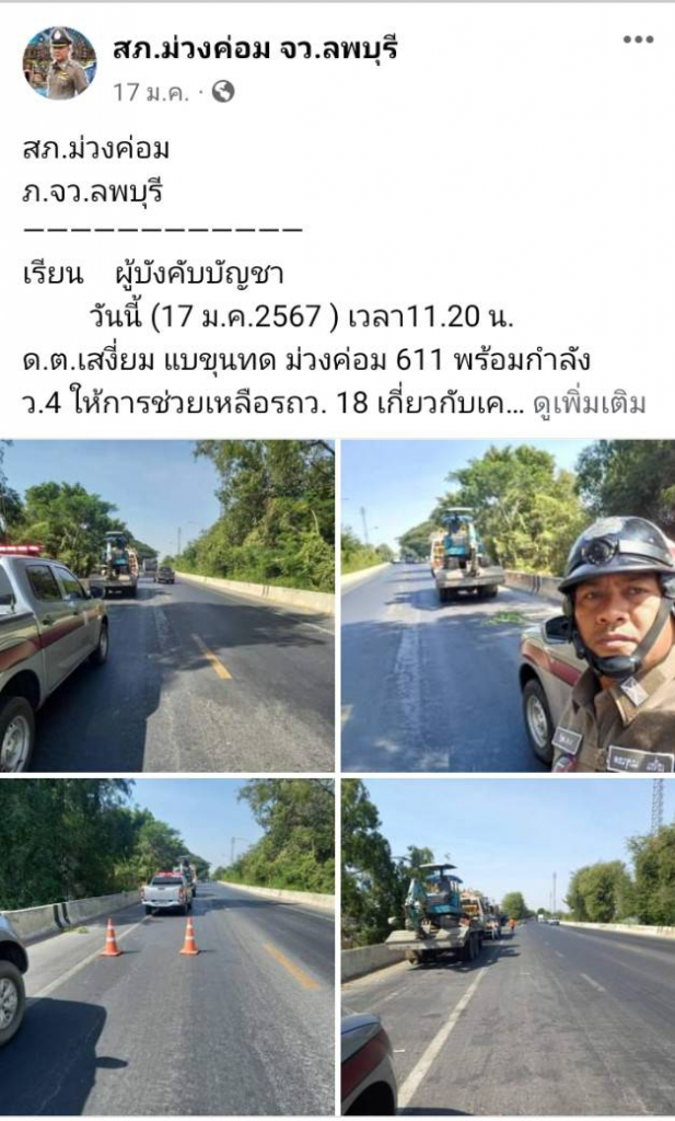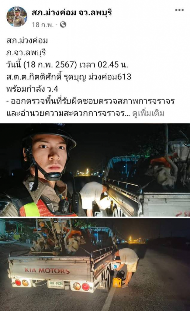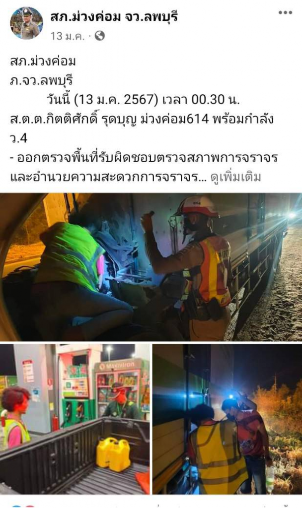 ภ.จว.ลพบุรีวันที่ (18 ก.พ. 2567) เวลา 02.45 น.ส.ต.ต.กิตติศักดิ์ รุดบุญ ม่วงค่อม613พร้อมกำลัง ว.4- ออกตรวจพื้นที่รับผิดชอบตรวจสภาพการจราจร และอำนวยความสะดวกการจราจร- ให้ความช่วยเหลือรถบรรทุก ว.18 รถบรรทุกน้ำมันหมด เบื้องต้นได้ทำการช่วยเหลือเรียบร้อยสถานที่ ถนนสุรนารายณ์ (205) หน้าร้านค้า ดวงดาว ม.6ต.เขาแหลม อ.ชัยบาดาล จ.ลพบุรี 15130