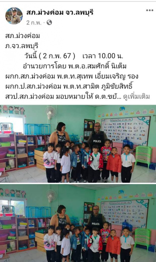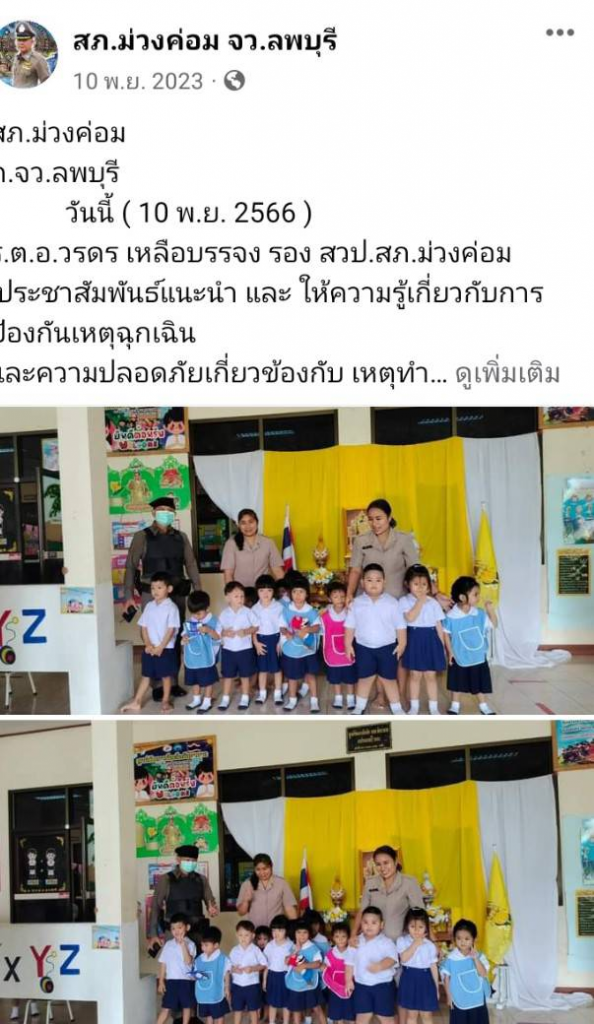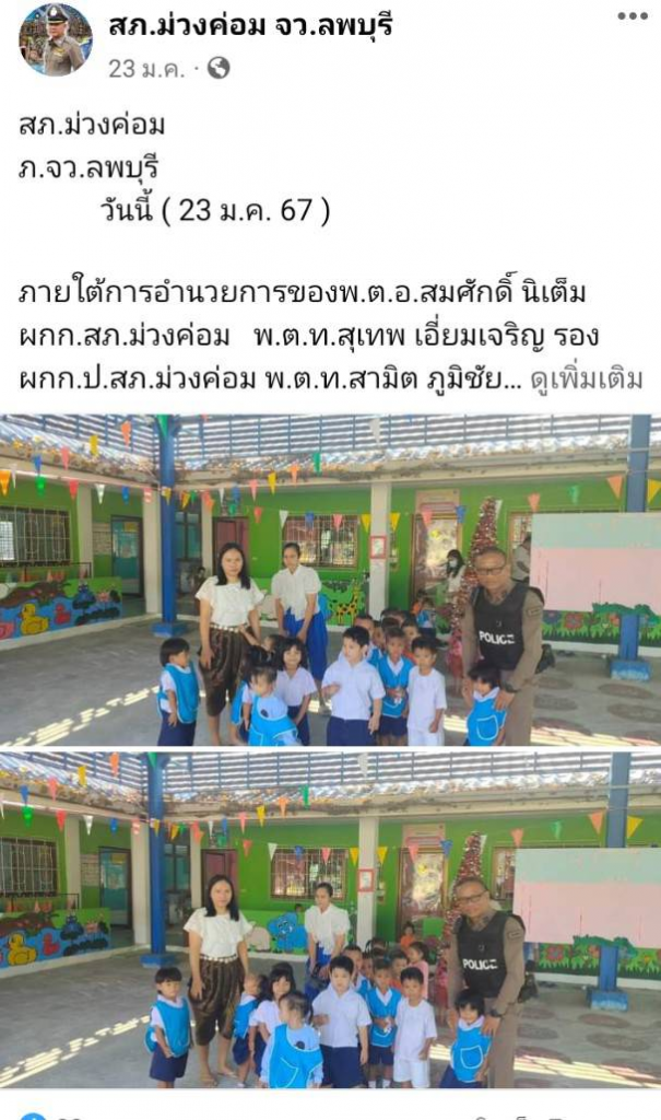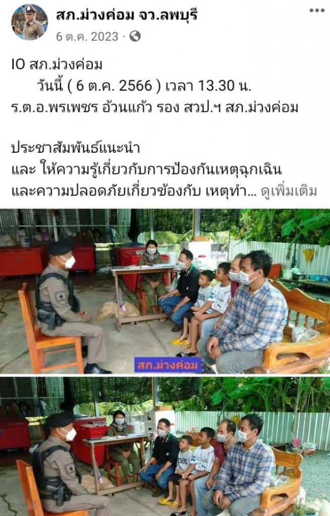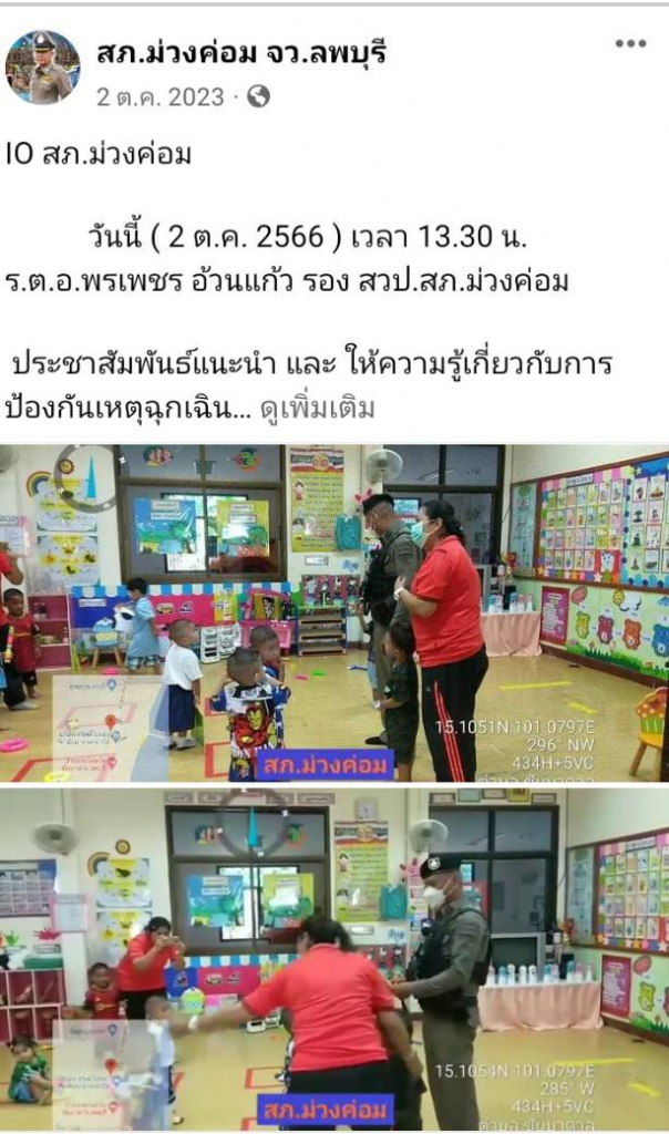 ภายใต้การอำนวยการของพ.ต.อ.สมศักดิ์ นิเต็ม ผกก.สภ.ม่วงค่อม พ.ต.ท.สุเทพ เอี่ยมเจริญ รอง ผกก.ป.สภ.ม่วงค่อม พ.ต.ท.สามิต ภูมิชัยสิทธิ์ สวป.สภ.ม่วงค่อมมอบหมายให้ ด.ต.ขยัน ดอนสว่าง ผบ.หมู่.(ป.).สภ.ม่วงค่อม ประชาสัมพันธ์แนะนำและ ให้ความรู้เกี่ยวกับการป้องกันเหตุฉุกเฉินและความปลอดภัยเกี่ยวข้องกับ เหตุทำร้ายกราดยิง, เหตุบุคคลคลุ้มคลั่ง, บุคคลภัยอันตรายให้กับคุณครูและนักเรียนศูนย์พัฒนาเด็กเล็ก อบต.เขาแหลม ต.เขาแหลม อ.ชัยบาดาล จว.ลพบุรี ตามนโยบาย ขับเคลื่อนไทยไปด้วยกัน