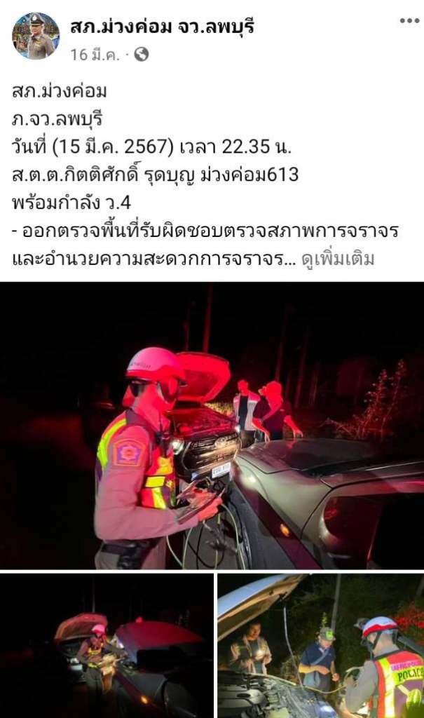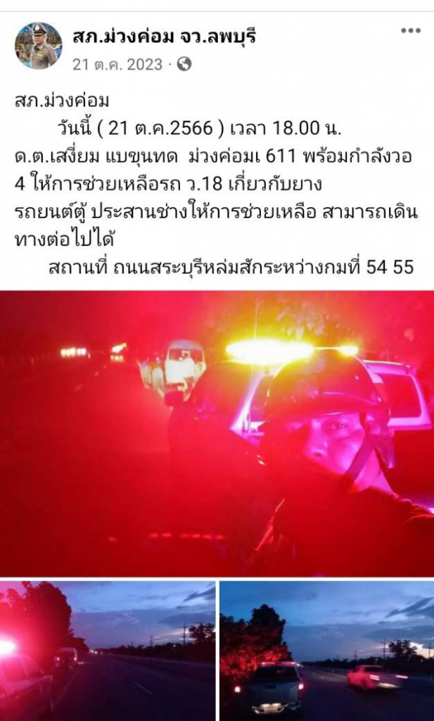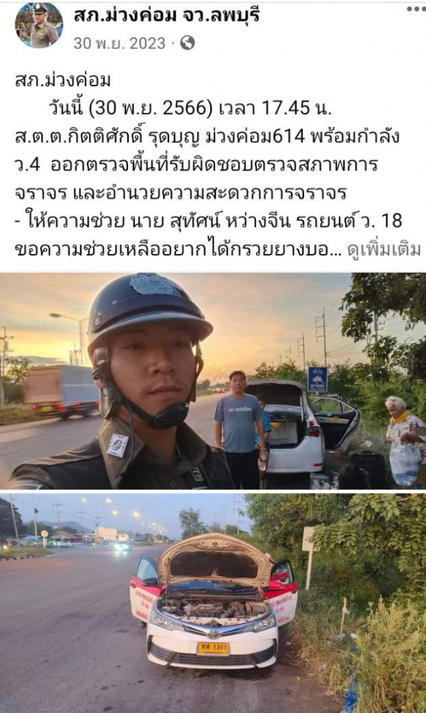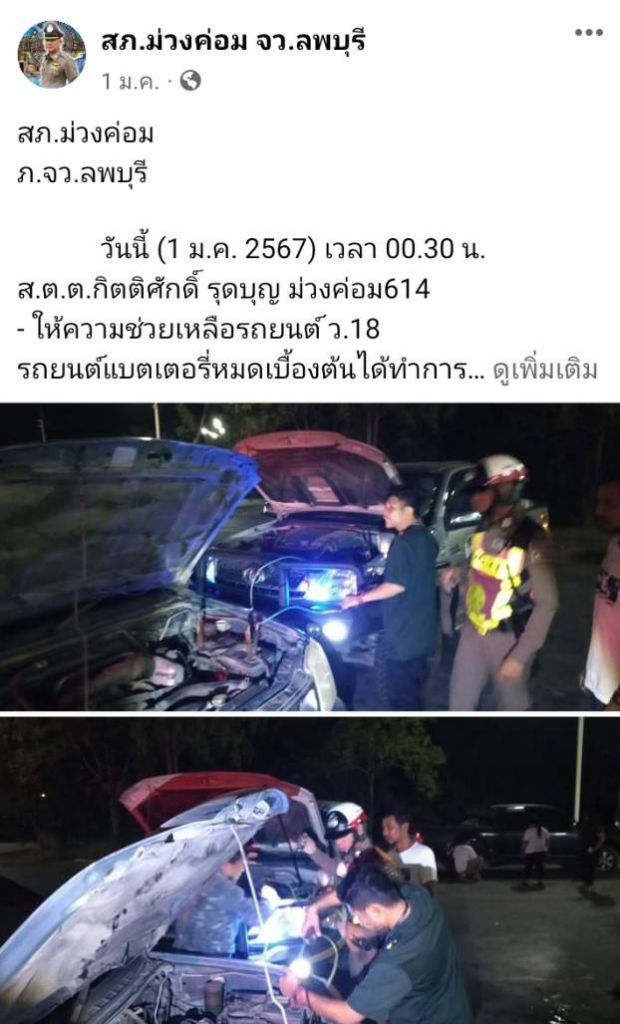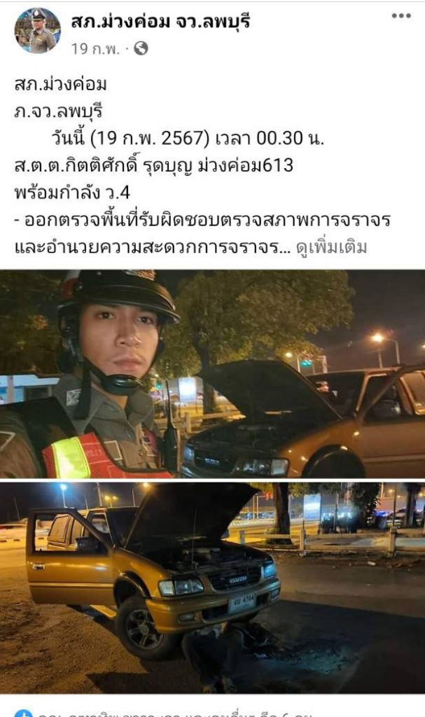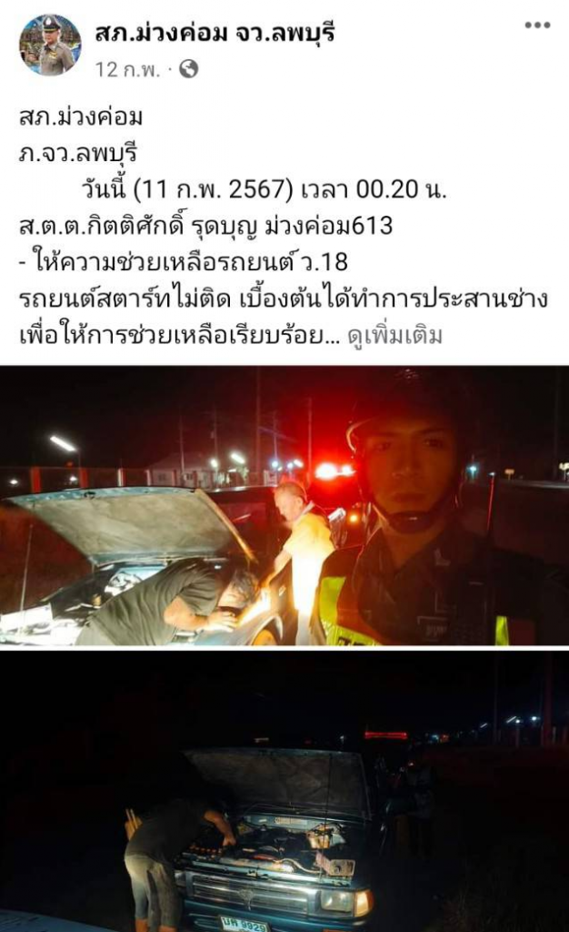 วันที่ (19 ก.พ. 2567) เวลา 00.30 น.ส.ต.ต.กิตติศักดิ์ รุดบุญ ม่วงค่อม613พร้อมกำลัง ว.4- ออกตรวจพื้นที่รับผิดชอบตรวจสภาพการจราจร และอำนวยความสะดวกการจราจร- ให้ความช่วยเหลือรถยนต์ ว.18 รถยนต์หม้อน้ำรั่ว เบื้องต้นได้ทำการช่วยเหลือเรียบร้อยสถานที่ ถนนสระบุรี – หล่มสัก (21) ตู้ยามสี่แยกม่วงค่อม ต.เขาแหลม อ.ชัยบาดาล จ.ลพบุรี 15130