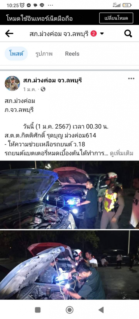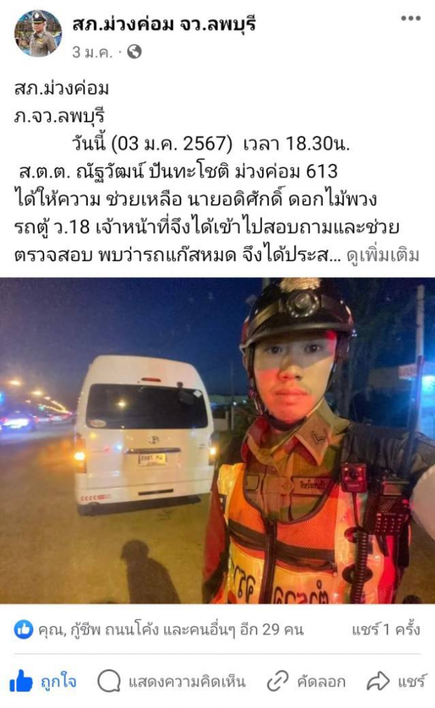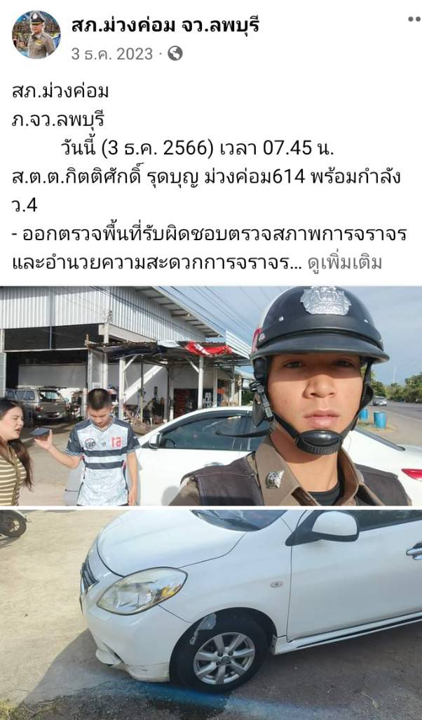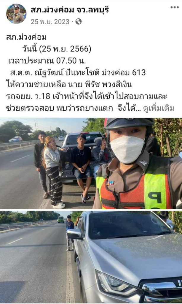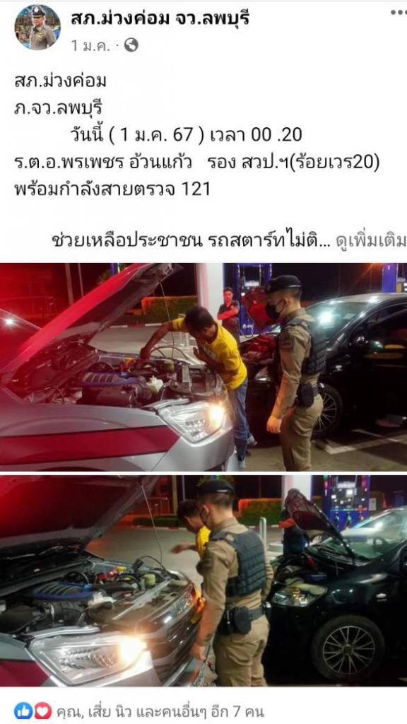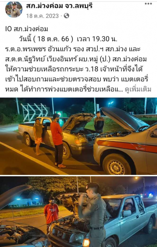 วันที่ (19 ก.พ. 2567) เวลา 00.30 น.ส.ต.ต.กิตติศักดิ์ รุดบุญ ม่วงค่อม613พร้อมกำลัง ว.4- ออกตรวจพื้นที่รับผิดชอบตรวจสภาพการจราจร และอำนวยความสะดวกการจราจร- ให้ความช่วยเหลือรถยนต์ ว.18 รถยนต์หม้อน้ำรั่ว เบื้องต้นได้ทำการช่วยเหลือเรียบร้อยสถานที่ ถนนสระบุรี – หล่มสัก (21) ตู้ยามสี่แยกม่วงค่อม ต.เขาแหลม อ.ชัยบาดาล จ.ลพบุรี 15130
