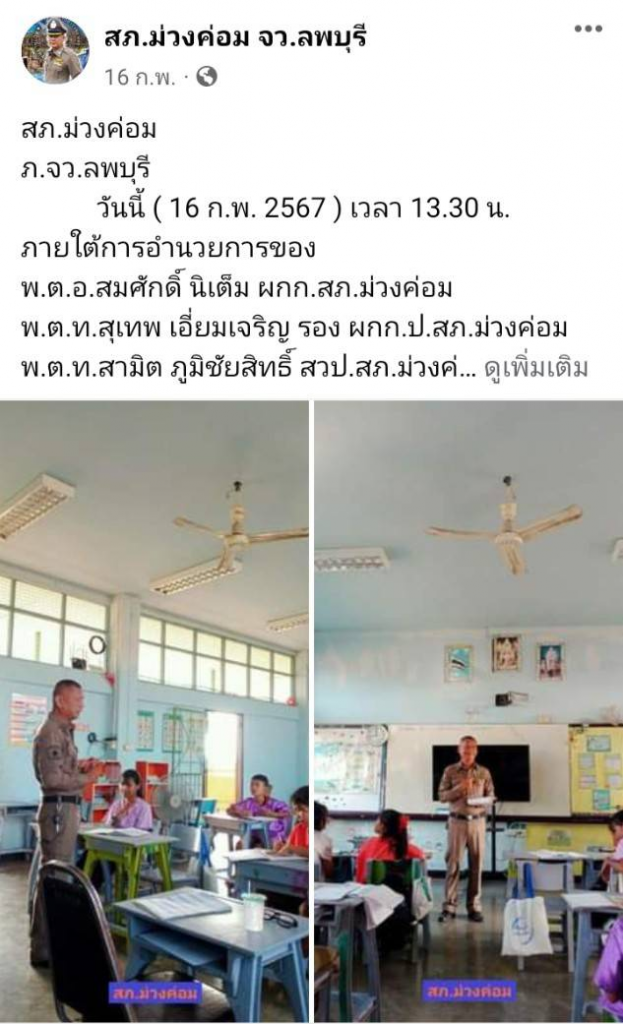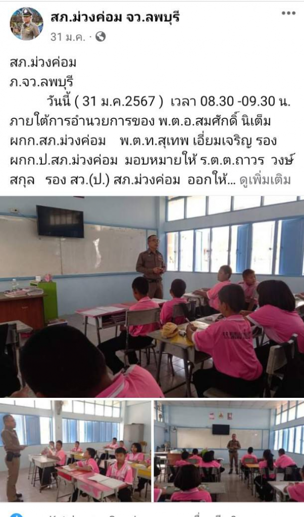 วันที่ ( 22 ม.ค. 67 ) เวลา 08.30.น. อำนวยการโดย พ.ต.อ.สมศักดิ์ นิเต็ม ผกก.สภ.ม่วงค่อม มอบหมายให้ ร.ต.อ.พรเพชร อ้วนแก้ว รอง สวป.สภ.ม่วงค่อม พร้อมกำลังสายตรวจ , จราจร บรรยายความรู้เกี่ยวกับด้านการจราจร ให้กับนักเรียนโรงเรียนชัยบาดาลพิทยาคม ต.ม่างค่อม อ.ชัยบาดาล จ.ลพบุรี