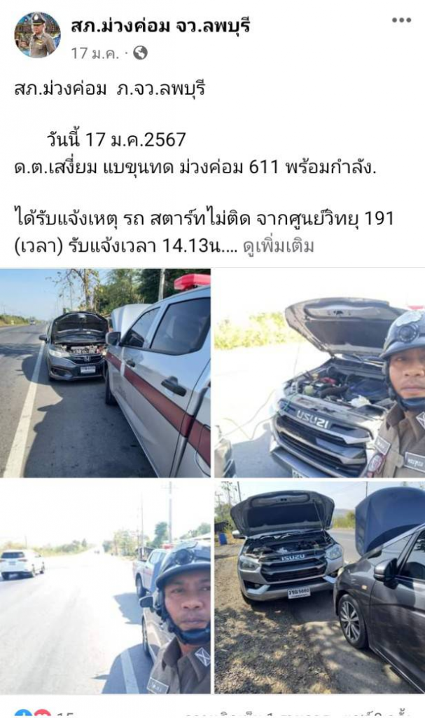 ภ.จว.ลพบุรีวันนี้ (11 ก.พ. 2567) เวลา 00.20 น.ส.ต.ต.กิตติศักดิ์ รุดบุญ ม่วงค่อม613- ให้ความช่วยเหลือรถยนต์ ว.18รถยนต์สตาร์ทไม่ติด เบื้องต้นได้ทำการประสานช่างเพื่อให้การช่วยเหลือเรียบร้อยสถานที่ เหตุเกิดบริเวณ ถนนสุรนารายณ์ (205) หน้าบริษัทอีเนอร์คิว จำกัด ต.เขาแหลม อ.ชัยบาดาล จ.ลพบุรี 15130