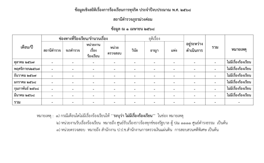 ข้อมูลสถิติเรื่องร้องเรียนการทุจริตและประพฤติมิชอบของเจ้าหน้าที่ของสถานีตำรวจภูธรม่วงค่อม