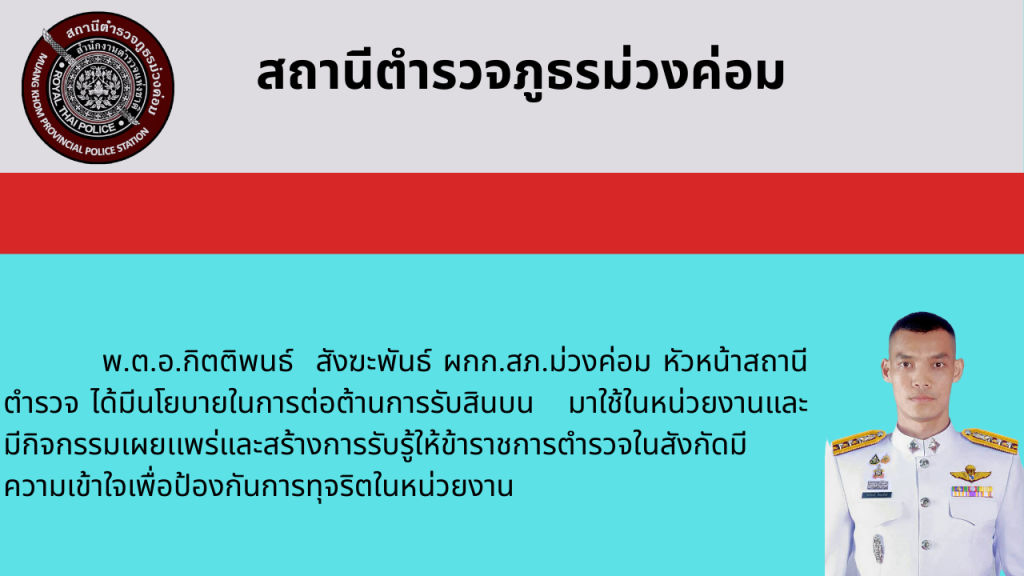 วันที่ 5 มีนาคม 68 พ.ต.อ.กิตติพนธ์ สังฆะพันธ์ ผกก.สภ.ม่วงค่อม เวลา 13.30 น.ได้จัดการประชุมข้าราชการตํารวจในสังกัด เพื่อชี้แจง และประกาศ เจตจํานง ในการนํานโยบายการต่อต้านการรับสินบน (Anti- Bribery Policy) ไปปฏิบัติ เพื่อให้ทุกคนทราบและปฏิบัติ โดยชี้แจงให้เข้าถึง การไม่รับของขวัญ ของกํานัลตามประกาศของสถานี เป็นสิ่งที่ต้องปฏิบัติตามประกาศโดยทุกคนทราบเเละ ตั้งมั่นปฏิบัติให้เกิดเป็นรูปธรรมและเป็นที่ประจักษ์ของสาธารณะชนโดยให้จัดทําประกาศติดไว้ที่จุดบริการประชาชนเพื่อให้ทราบโดยทั่วกัน